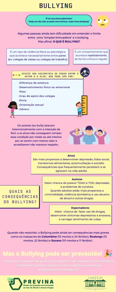 NoticiasAfinal, o que é Bullying? Posted on 5 de março de 202126 de junho de 2025 by previna@eisi 05 mar Por Valdemir Ferreira Júnior Programa de prevenção do Ministério da Saúde reduz a iniciação ao uso de álcool por adolescentes Associação do uso de drogas e problemas comportamentais em adolescentes