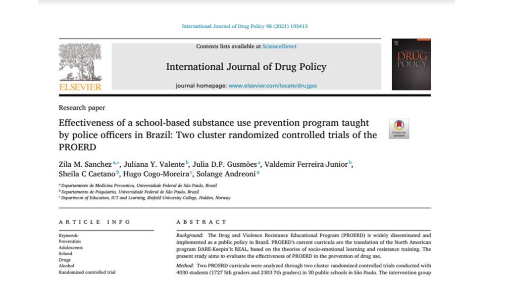 Para a avaliação da efetividade dos dois currículos do PROERD foram realizados dois ensaios controlados randomizados, entre 4.030 estudantes, sendo 1.727 estudantes do 5º ano e 2.303 estudantes do 7º ano, num total de 30 escolas estaduais. As escolas foram randomizadas entre grupo controle, que não recebeu o programa, e grupo intervenção, que recebeu as 10 aulas do programa. Foram incluídas na lista de sorteio todas as escolas estaduais, localizadas no município de São Paulo, que não haviam recebido o programa PROERD nos 3 anos anteriores à pesquisa, visando evitar contaminação do grupo controle. O estudo foi financiado da Fundação de Amparo à Pesquisa do Estado de São Paulo (FAPESP) e publicado em setembro de 2021 na revista científica International Journal of Drug Policy (IJDP).